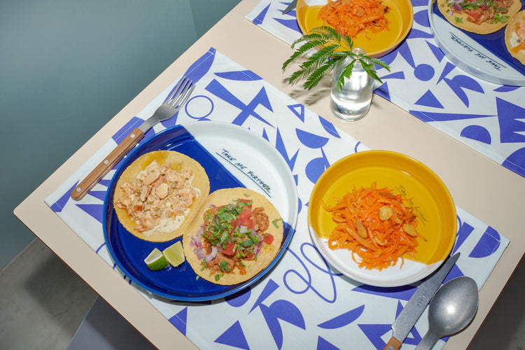 2種類の釉薬で「海」と「砂漠」を連想するカラーリングを施したプレートと、旅に出たときのようなワクワクする気持ちをデザインしたプレイスマット。
