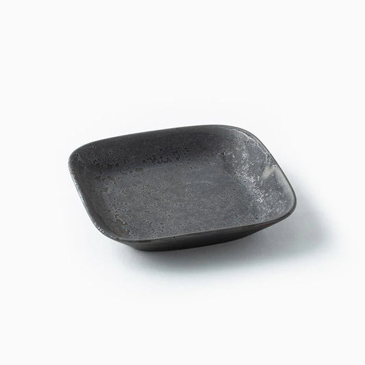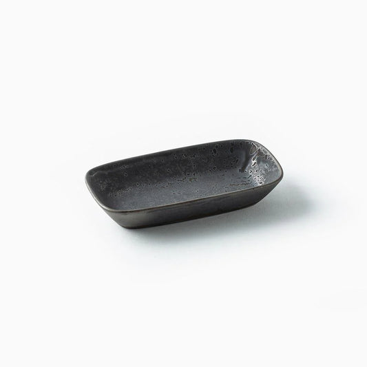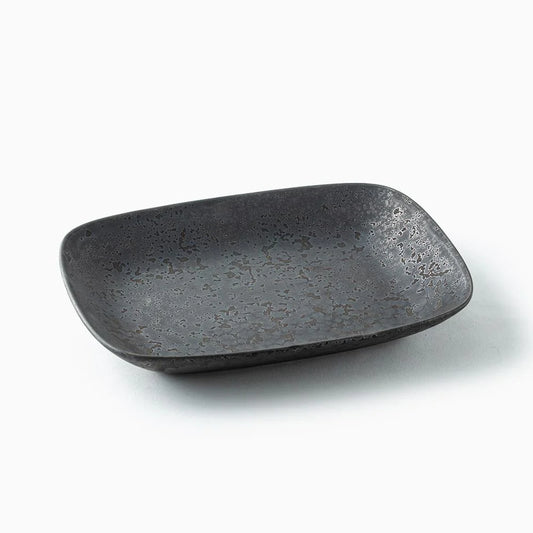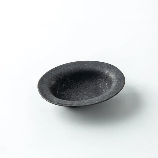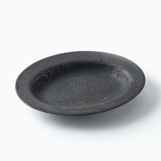 桜島の火山灰を用いた独自の釉薬が施された「Pebble(ぺブル)」シリーズ。マットな黒の上にキラキラとした油適が美しく広がるデザインは存在感抜群です。磁気ながら鉄のような独特な質感は、重厚感とアンティークな趣が漂い、料理を格調高く引き立ててくれます。使い込むほどにマットな風合いが増し、味わい深くなります。光の当たり方で輝きに変化があり眺めるだけでも楽しい一品。