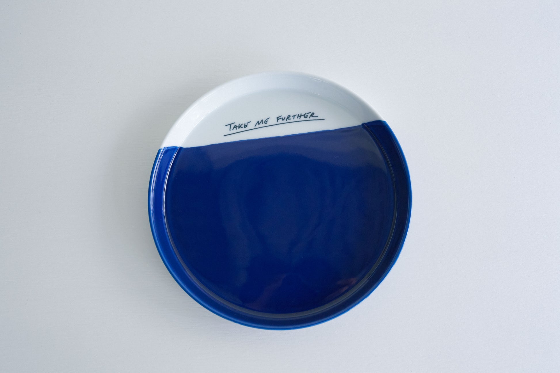 2種類の釉薬による染色で「海」を連想させるディープ・ブルー色に、旅の魅力とそこに対する日常生活での“欲求”を表した「TAKE MEFURTHER(遠くに連れて行って)」 のキャッチフレーズをプリント。デザインは「BobFoundation」、制作は⻄海陶器が担当。